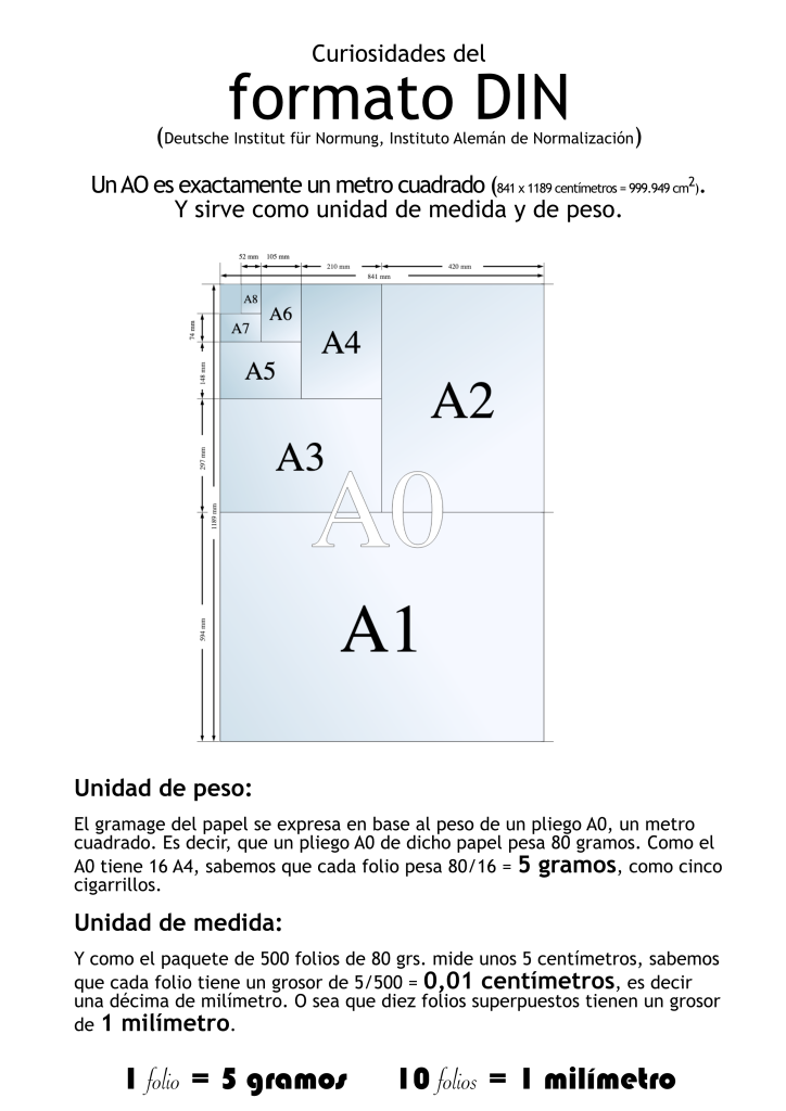 Curiosidades del formato DIN (Deutsche Institut für Normung, Instituto Alemán de Normalización) Un AO es exactamente un metro cuadrado (841 x 1189 centímetros = 999.949 cm2). Y sirve como unidad de medida y de peso.