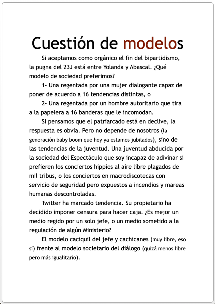 Si aceptamos como orgánico el fin del bipartidismo, la pugna del 23J está entre Yolanda y Abascal. ¿Qué modelo de sociedad preferimos?
