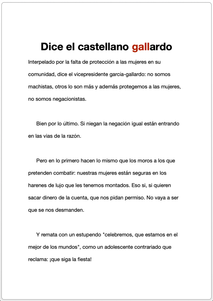 Pero en lo primero hacen lo mismo que los moros a los que pretenden combatir: nuestras mujeres están seguras en los harenes de lujo que les tenemos montados. Eso si, si quieren sacar dinero de la cuenta, que nos pidan permiso. No vaya a ser que se nos desmanden.