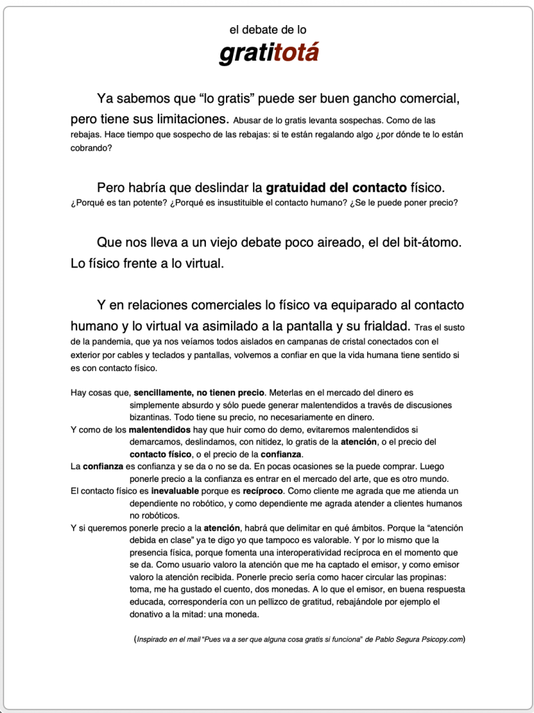 (Inspirado en el mail “Pues va a ser que alguna cosa gratis si funciona” de Pablo Segura Psicopy.com)