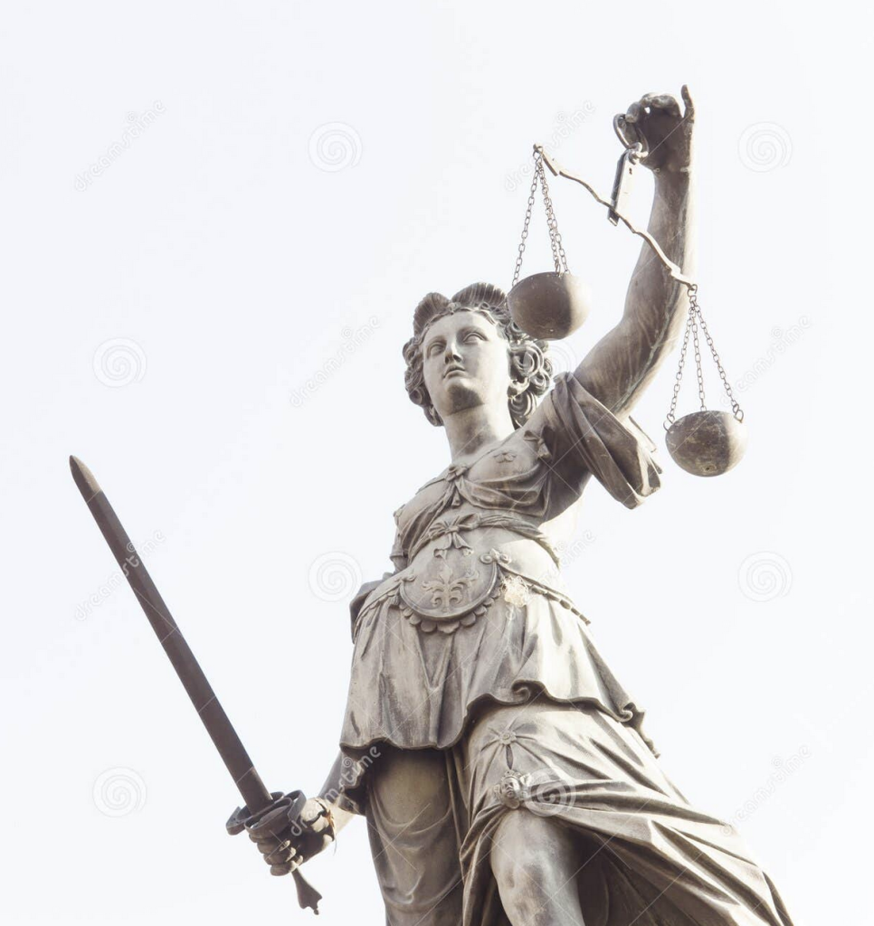 La imagen de la justicia transmitida por los ancestros, da cuenta de sus atributos: mujer (fuerza femenina) con los ojos vendados (imparcial, no mira a quién juzga), con una balanza (mide lo que juzga) y una espada (aplica la sentencia con firmeza). El fiel de la balanza marca el grado de desviación de lo considerado hacia la izquierda o hacia la derecha.