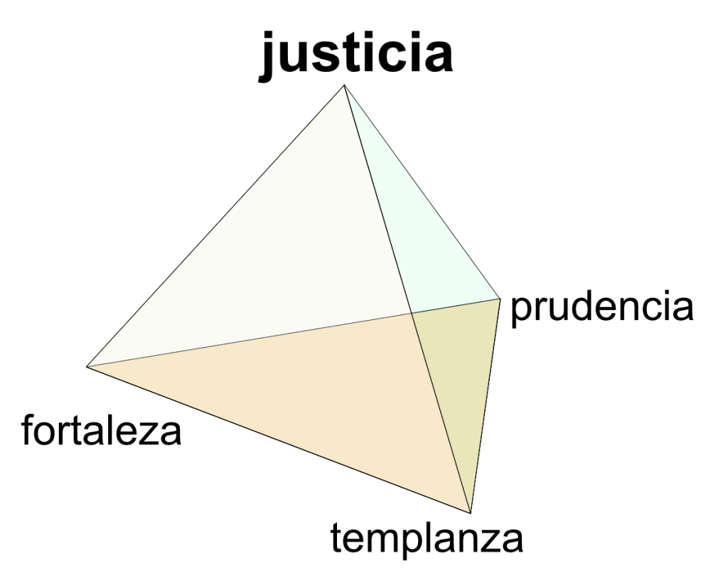 Platón (ver entrada “virtudes cardinales” en la wikipedia) incardina las virtudes cardinales en una imagen geométrica que les da contundencia gráfica, el tetraedro equilátero. Hasta entonces se contemplaban tres virtudes en la areté o excelencia griega: justicia, fortaleza y templanza. Platón añade la Prudencia, que bien pudiéramos considerar redundante con la Templanza, pero que ofrece la oportunidad de construir el tetraedro, añadiendo un cuarto punto que le dé a la inicial imagen triangular una tercera dimensión que le da una estructura prácticamente indestructible: la imagen mínima del biselado diamantino de múltiples caras. Con la Justicia enseñoreando y generando a las otras tres que, paralelamente, convocan entre ellas a la Justicia deseada.